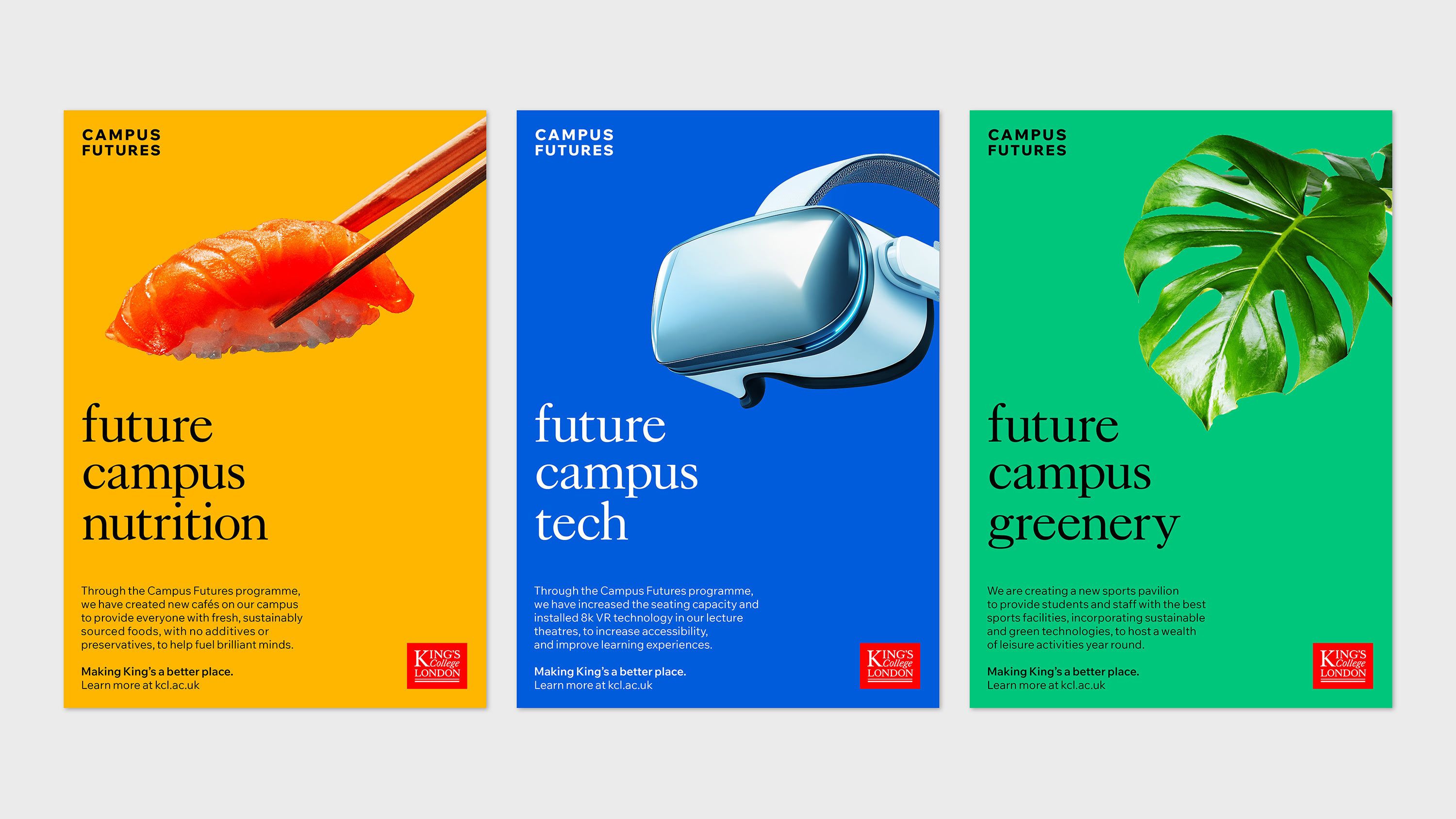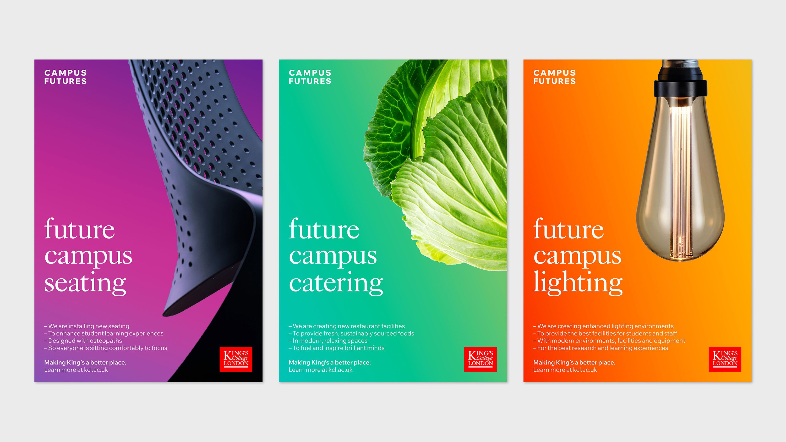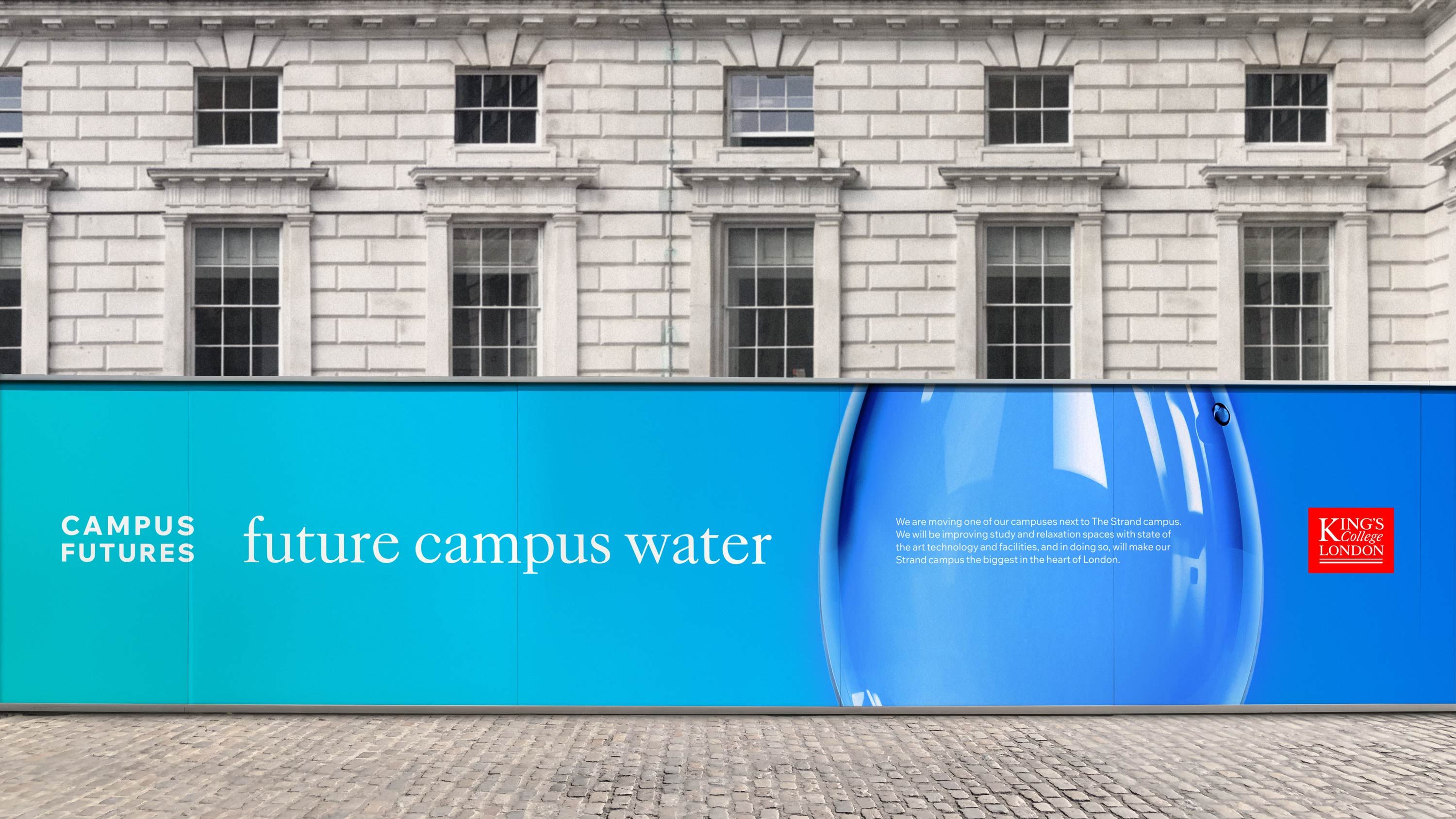 Estates & Facilities is the largest directorate within King’s College London. They are responsible for the maintenance and operation of more than 100 buildings and all campus facilities including catering, halls of residence, study spaces, working spaces and sports facilities. To enable the University to meet future growth targets, King’s need their campuses to become more operationally and financially efficient, whilst also reducing their carbon footprint. In response, they initiated a comprehensive masterplanning programme to transform the King’s estate, and needed help in articulating and communicating this vision. So the King’s Estates & Facilities team asked Rose to help them define a narrative and create a distinctive and confident campaign identity to create awareness of Campus Futures. They wanted the campaign to communicate its purpose, help the operations teams convey the many changes on campus, and encourage patience and understanding from staff, students and visitors.