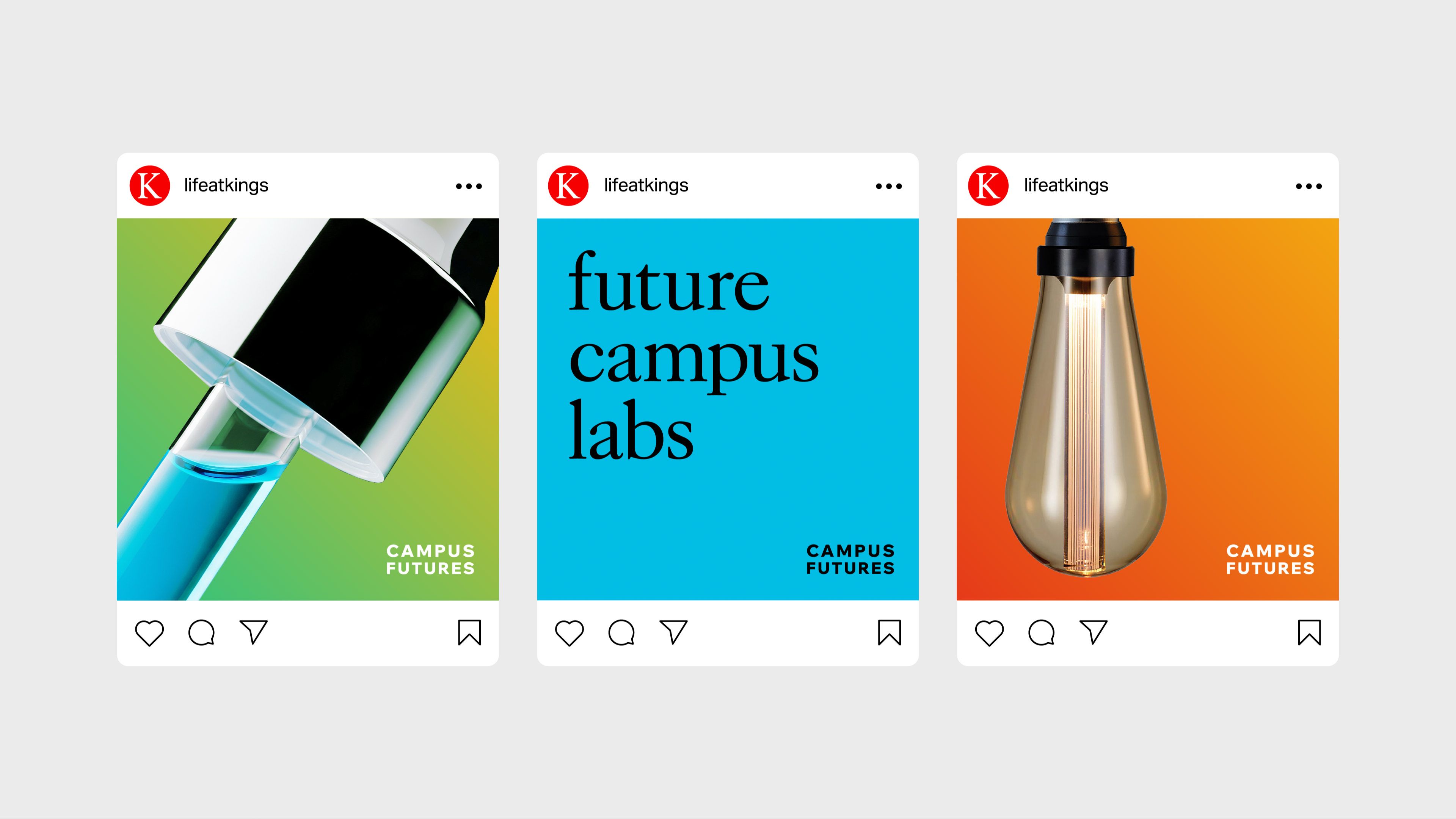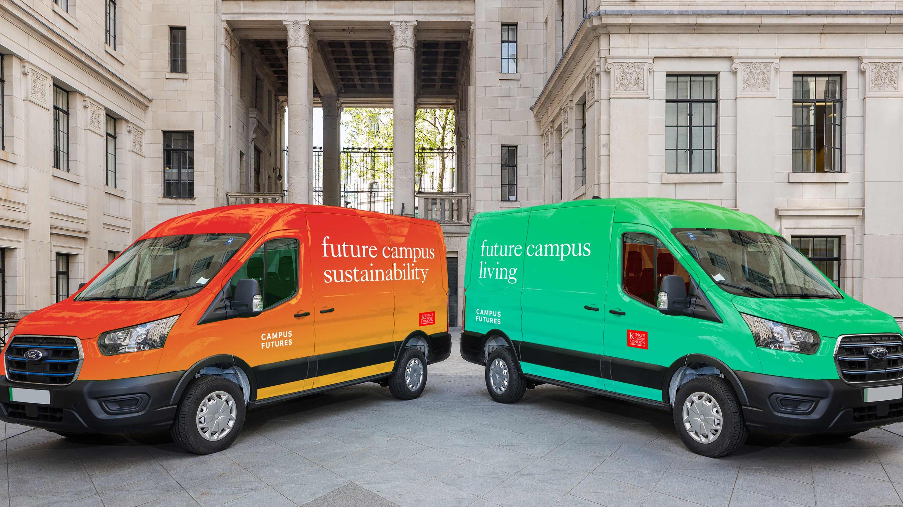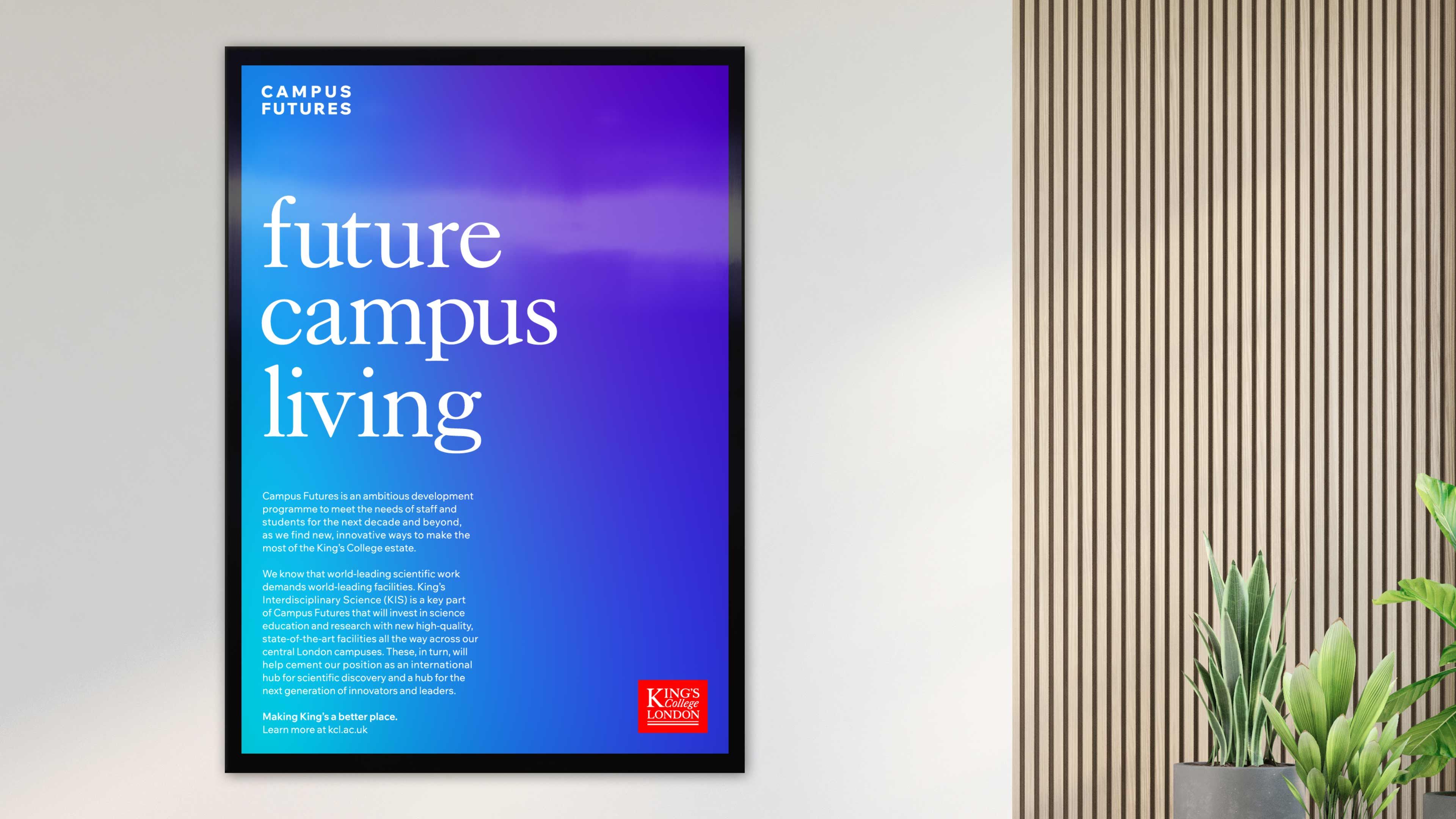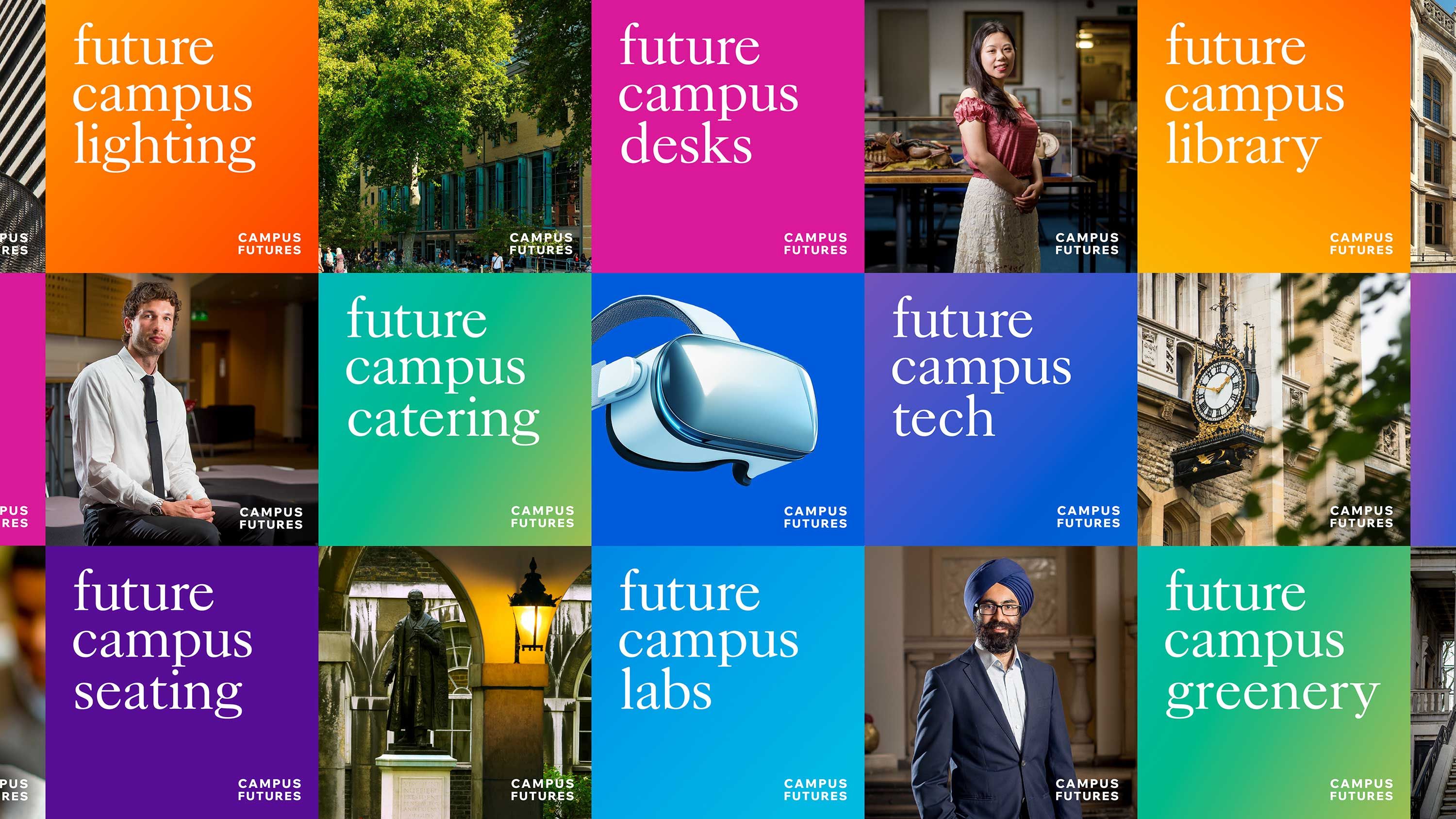 Estates & Facilities is the largest directorate within King’s College London. They are responsible for the maintenance and operation of more than 100 buildings and all campus facilities including catering, halls of residence, study spaces, working spaces and sports facilities. To enable the University to meet future growth targets, King’s need their campuses to become more operationally and financially efficient, whilst also reducing their carbon footprint. In response, they initiated a comprehensive masterplanning programme to transform the King’s estate, and needed help in articulating and communicating this vision. So the King’s Estates & Facilities team asked Rose to help them define a narrative and create a distinctive and confident campaign identity to create awareness of Campus Futures. They wanted the campaign to communicate its purpose, help the operations teams convey the many changes on campus, and encourage patience and understanding from staff, students and visitors.