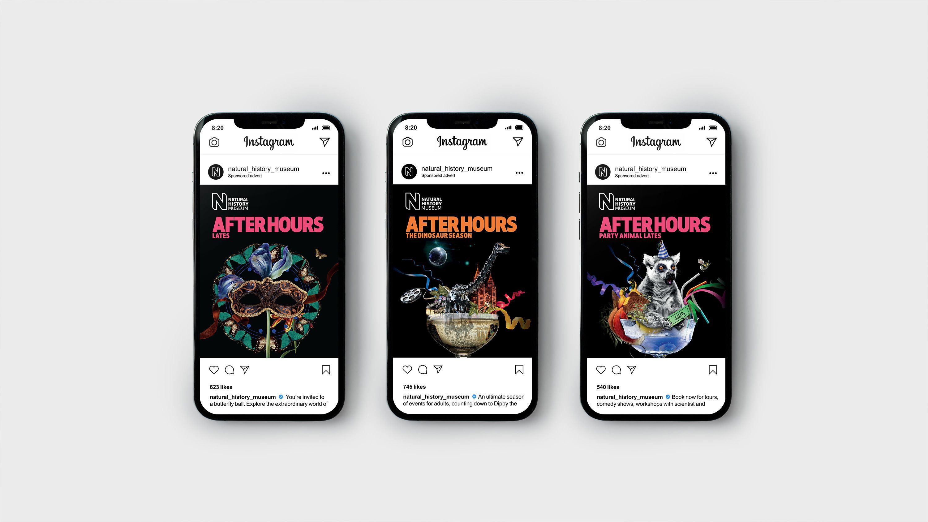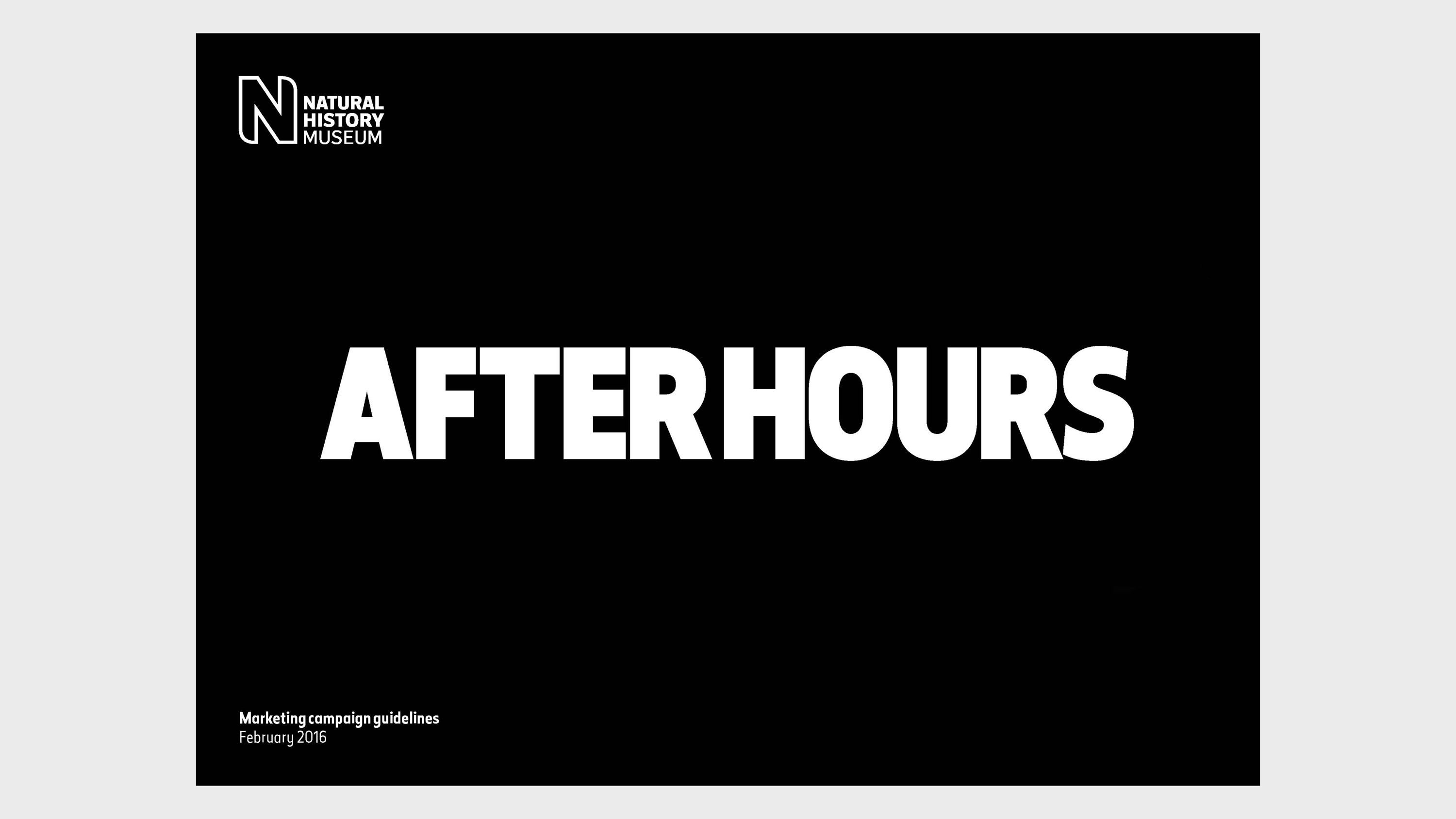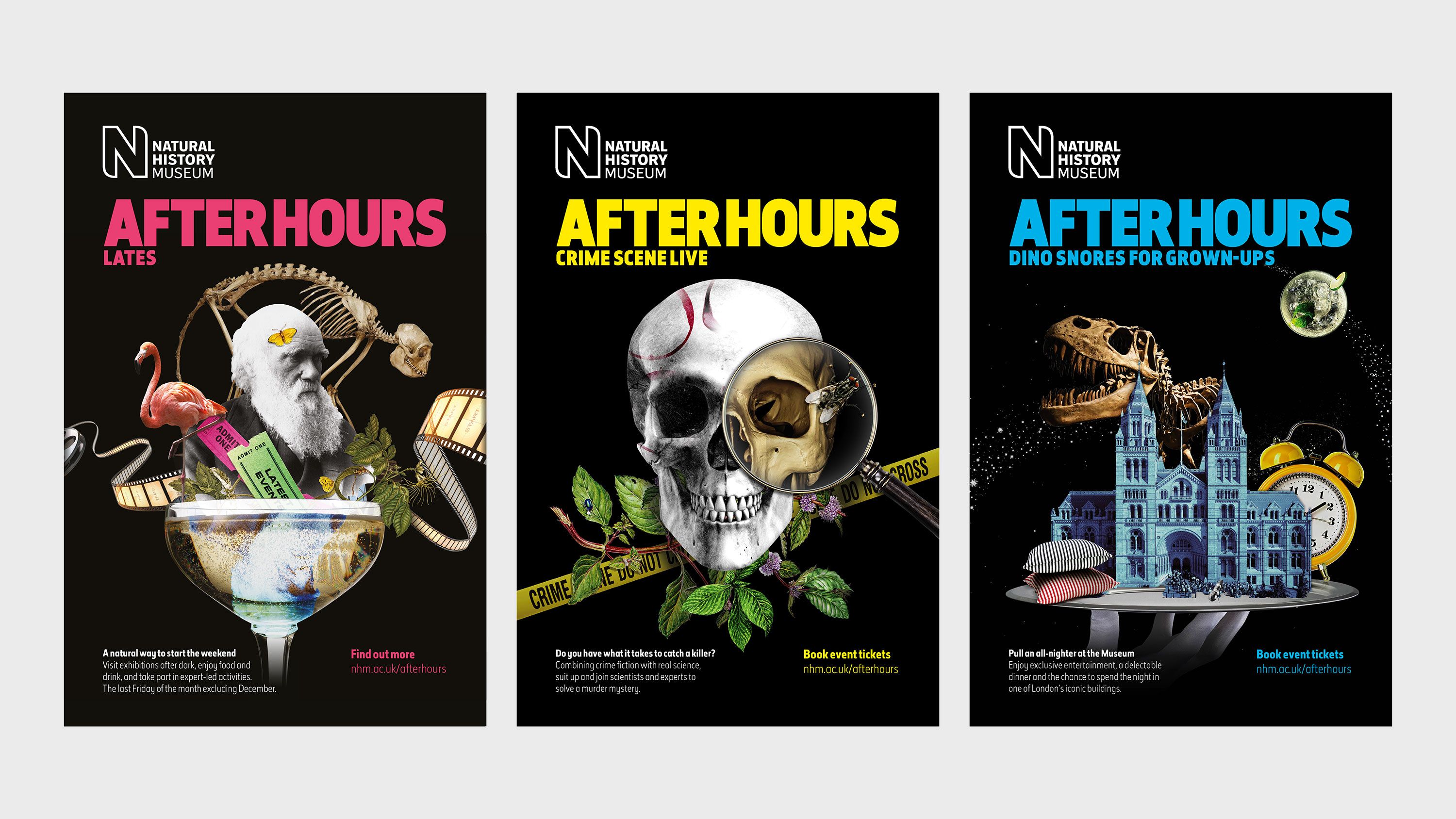 The museum hosts a series of evening events for adults – entitled ‘After Hours’ – on the last Friday of each month. With a renewed focus on developing their 18-35 audiences, The Natural History Museum asked Rose to redesign the campaign identity for After Hours, to raise awareness of their events, attract audiences and increase ticket sales. The Natural History Museum wanted to bring together all their current and future evening events under an umbrella identity that would appeal to “contemporary-cultured” and “learned-liberal” audience segments, whilst supporting the Museum’s position of authenticity in the natural world. The museum wanted Rose to use their masterbrand identity assets, but create a recognisable campaign identity for After Hours that reflected the uniqueness of their evening events, whilst conveying the diverse range of experiences on offer.