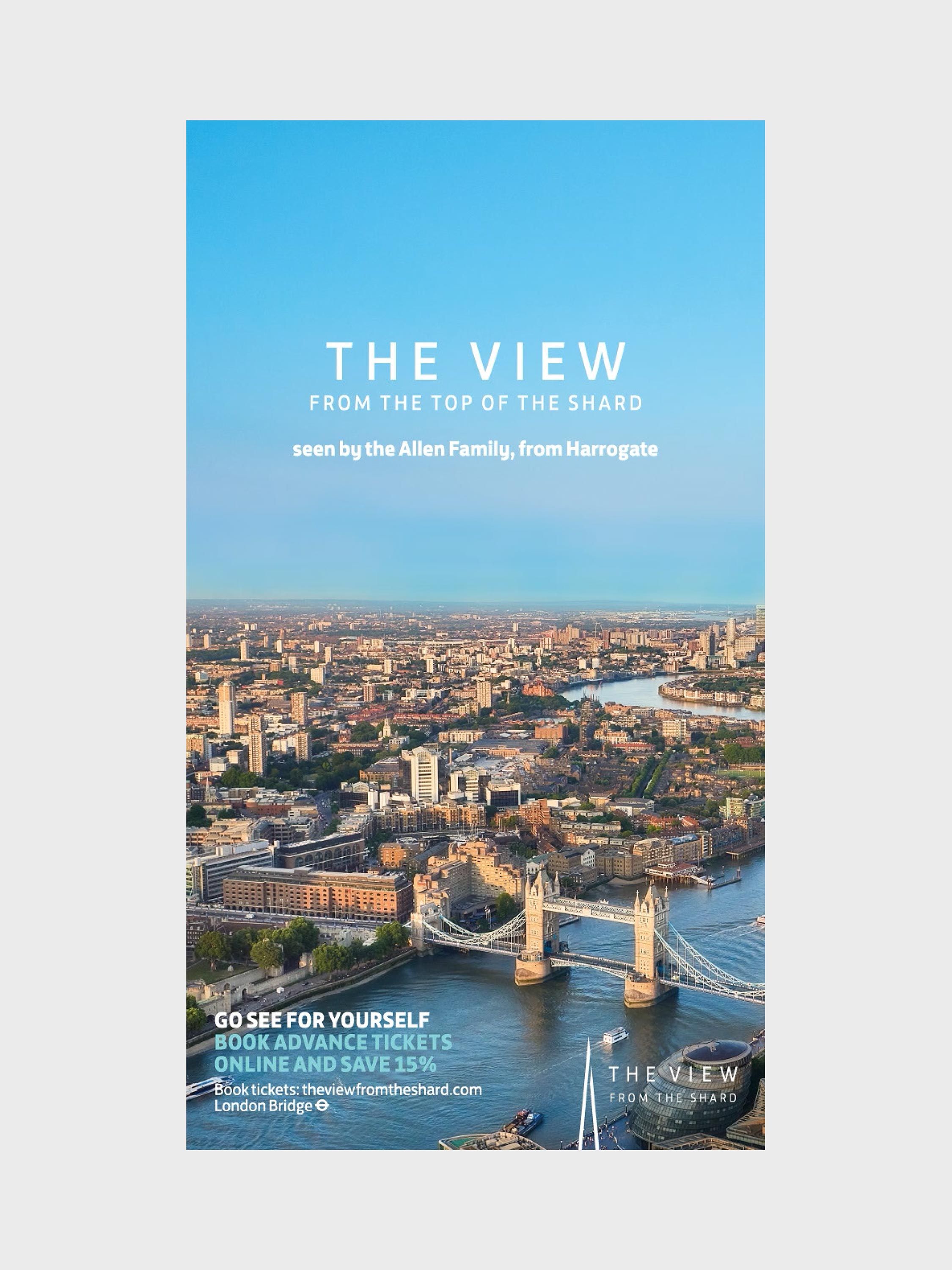 The View from The Shard wanted to increase awareness and interest in their brand experience. They wanted their brand to stand out from The Shard itself, while remaining aligned to the world famous landmark. They also wanted to raise their profile in listings and rankings to be considered one of the top London visitor attractions. The View from The Shard asked Rose to create a compelling brand strategy to inform the creative direction for all brand communications, advertising and visitor experience touch-points, including secondary-spend opportunities. They wanted a new look and feel for their brand communications, which could help to underpin their promise that the best views of London are from the very top of The Shard.
